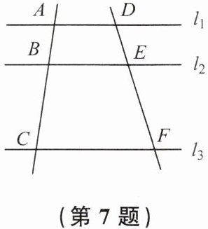 7. 如图,直线$l_1// l_2// l_3$,直线$AC交l_1$,$l_2$,$l_3于点A$,$B$,$C$,直线$DF交l_1$,$l_2$,$l_3于点D$,$E$,$F$. 已知$\frac{AB}{AC} = \frac{1}{3}$,则$\frac{EF}{DE} = $