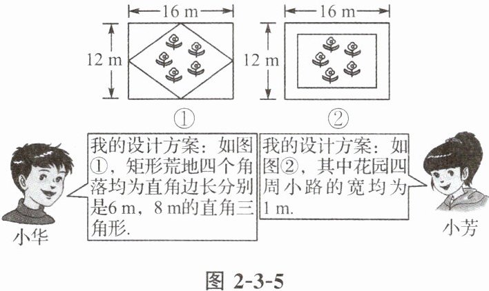 6. 计划在一块长 $16$ m、宽 $12$ m 的矩形荒地上建造一个花园,要求花园面积是荒地面积的一半,如图 2 - 3 - 5 分别是小华与小芳的设计方案. 在小组讨论时,同学们都认为小华的方案是正确的,但对小芳的方案是否符合条件有不同意见,你认为小芳的方案符合条件吗? 若不符合,请你依照小芳的方案设计小路的宽度.