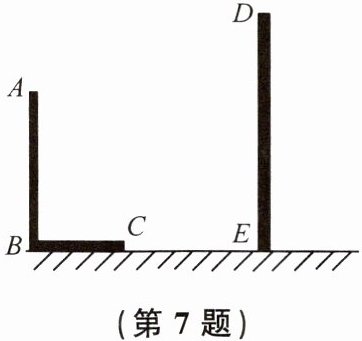 7. 如图,$AB和DE$是直立在地面上的两根立柱,$AB = 5m$,某一时刻$AB在阳光下的影长BC = 3m$,在测量$AB$的影长时,同时测量出$DE$在阳光下的影长为 $6m$,则$DE$的长为