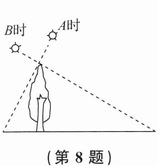 8. 如图,小明在$A$时测得一棵树的影长为 $2m$,在$B$时测得这棵树的影长为 $8m$. 若这两次日照的光线互相垂直,则树的高度为