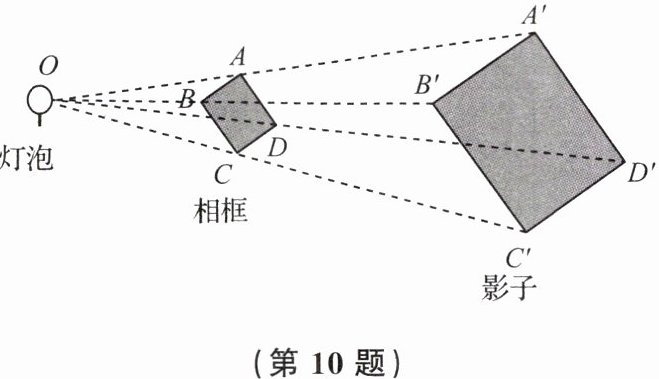 10. 如图,小芸用灯泡$O照射一个矩形相框ABCD$,在墙上形成影子$A{}^{\prime}B{}^{\prime}C{}^{\prime}D{}^{\prime}$. 现测得$OA = 20cm$,$OA{}^{\prime} = 50cm$,相框$ABCD的面积为80cm^2$,则影子$A{}^{\prime}B{}^{\prime}C{}^{\prime}D{}^{\prime}$的面积为