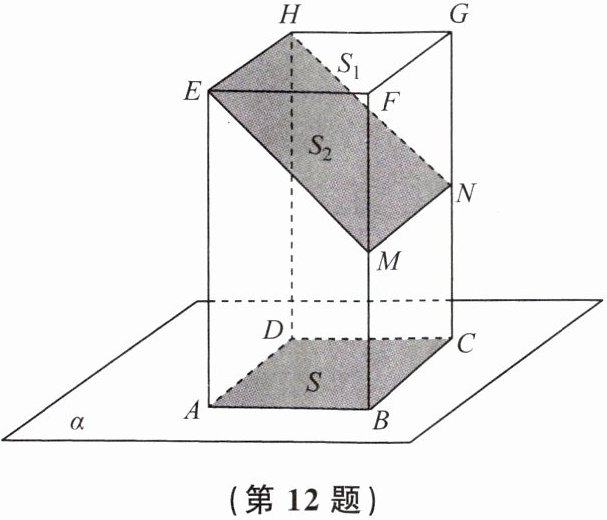 12. 如图,长方体的一个底面$ABCD在投影面\alpha$上,$M$,$N分别是侧棱BF$,$CG$的中点,矩形$EFGH与矩形EMNH的投影都是矩形ABCD$. 设它们的面积分别是$S_{1}$,$S_{2}$,$S$,则$S_{1}$,$S_{2}$,$S$的大小关系是