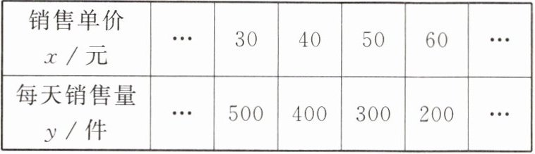 |每天销售量$y$/件|…|500|400|300|200|…|