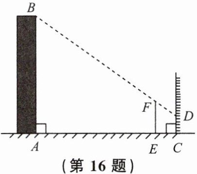 16.(本题10分)李航想利用太阳光测量楼高. 他带着皮尺来到一栋楼下,发现对面墙上有这栋楼的影子. 针对这种情况,他设计了一种测量方案,具体测量情况如下:如图,李航边移动边观察,发现当他站到点$E$处时,可以使自己落在墙上的影子与这栋楼落在墙上的影子重叠,且高度恰好相同. 此时,测得李航落在墙上的影子高度$CD = 1.2m$,$CE = 0.6m$,$CA = 30m$(点$A$,$E$,$C$在同一直线上). 已知李航的身高$EF是1.6m$,请你帮李航求出楼高$AB$.(李航看成是线段$EF$)
