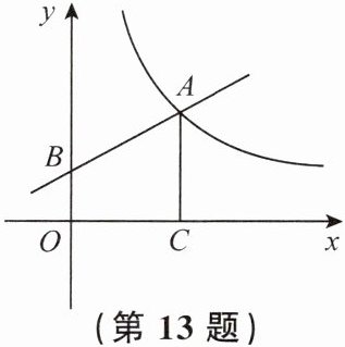 13.(本题 10 分)如图,已知点 $ A $ 在反比例函数 $ y = \frac{4}{x}(x > 0) $ 的图象上,过点 $ A $ 作 $ AC \perp x $ 轴,垂足是点 $ C $,$ AC = OC $.一次函数 $ y = kx + b $ 的图象经过点 $ A $,与 $ y $ 轴的正半轴交于点 $ B $.