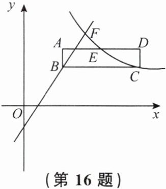 16.(本题 10 分)如图,矩形 $ ABCD $ 在平面直角坐标系的第一象限内,$ BC $ 与 $ x $ 轴平行,$ AB = 1 $,点 $ C $ 的坐标为 $ (6,2) $,点 $ E $ 是 $ AD $ 的中点.反比例函数 $ y_1 = \frac{k}{x}(x > 0) $ 的图象经过点 $ C $ 和点 $ E $,过点 $ B $ 的直线 $ y_2 = ax + b $ 与反比例函数的图象交于点 $ F $,点 $ F $ 的纵坐标为 4.