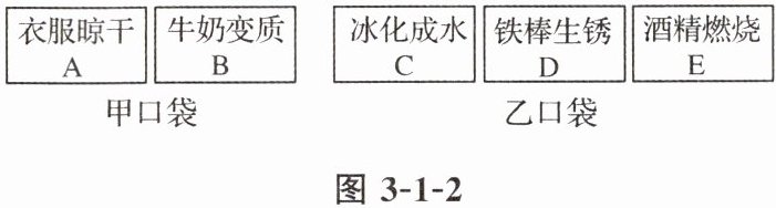 6. 老师为帮助学生正确理解物理变化与化学变化,将5种生活现象分别写在表面看上去无差别得5张卡片上,并分别放入甲、乙两个口袋中(如图3-1-2),甲口袋中装有A,B两张卡片,乙口袋中装有C,D,E三张卡片.小明从两个口袋中分别随机取出1张卡片,用画树状图或列表的方法,求抽出的两张卡片均是物理变化的概率.(注:没有生成其他物质的变化叫做物理变化;生成其他物质的变化叫做化学变化)