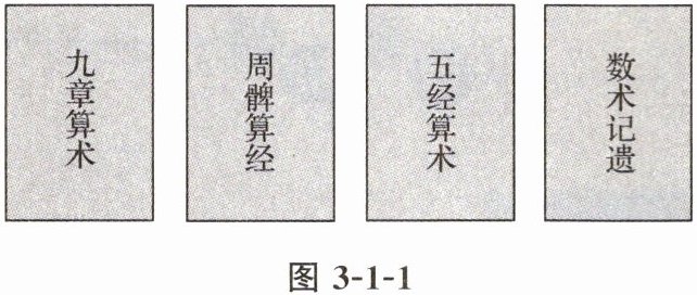 2. 某数学兴趣小组做了背面完全相同的4张卡片(如图3-1-1),正面分别写有《九章算术》《周髀算经》《五经算术》《数术记遗》,将4张卡片混合后正面朝下放置在桌面上,任意抽取2张卡片,求抽到的恰好是《九章算术》和《五经算术》的概率。