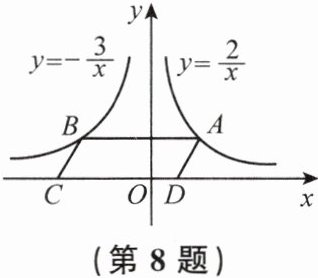 8. 如图,点$A是反比例函数y= \frac {2}{x}(x>0)$图象上任意一点,过点$A且平行于x轴的直线交反比例函数y= -\frac {3}{x}(x<0)的图象于点B$,以$AB为边作平行四边形ABCD$,其中$C,D在x$轴上,则四边形$ABCD$的面积为(