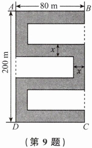 9. 如图所示的矩形$ABCD$为学校教学楼区域的平面示意图,其中的阴影部分为“弓”字形楼体,“弓”字形各部分的宽度均相同.已知$AB$的长为80m,$AD$的长为200m,空地面积是整个矩形$ABCD$区域面积的70%.若设“弓”字形楼体各部分的宽度为$x$m,则$x$应满足的方程是(