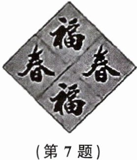 7. 北京时间2024年12月4日,中国申报的“春节——中国人庆祝传统新年的社会实践”通过评审,列人联合国教科文组织人类非物质文化遗产代表作名录.现将四张大小相同的正方形卡片拼成如图所示的正方形靶盘(其中两张卡片上是“春”字,另外两张上是“福”字).现向该靶盘随机掷两次飞镖,则两次射中的卡片上的字不相同的概率为(