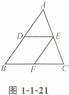 2. 如图 1-1-21,在△ABC 中,点 D,E 分别是 AB,AC 的中点,连接 DE,过点 E 作 EF//AB,交 BC 于点 F。