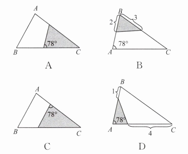 2. 在△ABC 中,∠A = 78°,AB = 4,AC = 6,下列选项中阴影部分三角形与原△ABC 不相似的是(