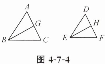 2. 如图 4 - 7 - 4,$\triangle ABC\backsim\triangle DEF$,$BG$,$EH分别是\triangle ABC和\triangle DEF$的角平分线,$BC = 6\mathrm{cm}$,$EF = 4\mathrm{cm}$,$BG = 4.8\mathrm{cm}$.则$EH$的长为(