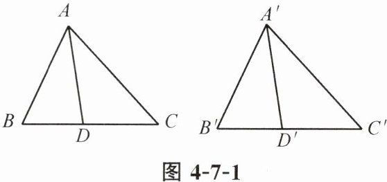 1. 如图 4 - 7 - 1,已知$\triangle ABC\backsim\triangle A'B'C'$,$AD与A'D'分别是\triangle ABC与\triangle A'B'C'$的角平分线,则下列等式成立的是(