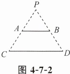 3. 如图 4 - 7 - 2,电灯$P在横杆AB$的正上方,$AB在灯光下的影子为CD$,$AB// CD$,$AB = 3\mathrm{m}$,$CD = 5\mathrm{m}$,点$P到AB的距离是2.4\mathrm{m}$,则$P到CD$的距离为