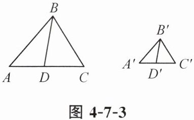 1. 如图 4 - 7 - 3,已知$\triangle ABC\backsim\triangle A'B'C'$,$BD和B'D'分别是\triangle ABC和\triangle A'B'C'$的中线,且$AB = 10$,$A'B' = 5$,$BD = 6$,则$B'D'$的长为(