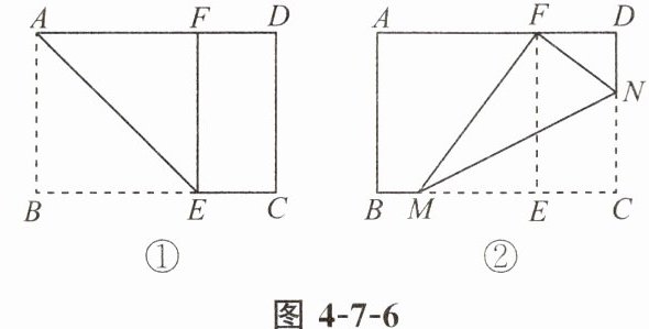 第二步:将图 4 - 7 - 6①中的矩形纸片折叠,使点$C恰好落在点F$处,得到折痕$MN$,如图 4 - 7 - 6②.