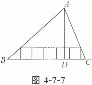 6. 如图 4 - 7 - 7,$\triangle ABC$是一块锐角三角形材料,边$BC = 120\mathrm{mm}$,高$AD = 80\mathrm{mm}$.如果按如图所示的方式加工成$n$个小正方形零件,则每个小正方形零件的边长是