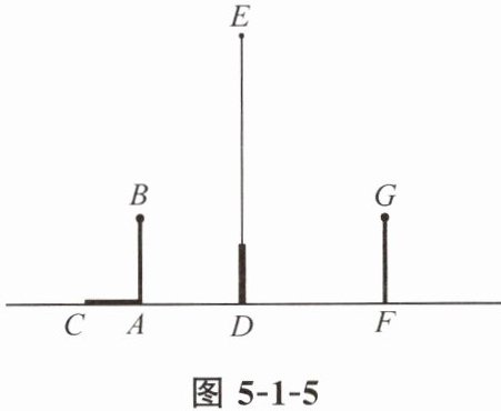 7. 如图 5-1-5,在路灯下,小明的身高用线段 AB 表示,他在地面上的影子用线段 AC 表示,小亮的身高用线段 FG 表示,路灯灯泡在线段 DE 上.