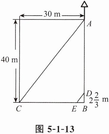8. 如图 5 - 1 - 13,在一个长 $ 40 $ m、宽 $ 30 $ m 的矩形小操场上,王刚从 $ A $ 地出发,沿着 $ A \to B \to C $ 的路线以 $ 3 $ m/s 的速度跑向 $ C $ 地。当他出发 $ 4 $ s 后,张华有东西需要交给他,就从 $ A $ 地出发沿王刚走的路线追赶。当张华跑到距 $ B $ 地 $ 2 \frac{2}{3} $ m 的 $ D $ 处时,他和王刚在阳光下的影子恰好重叠在同一条直线上。此时,$ A $ 处一根电线杆在阳光下的影子也恰好落在对角线 $ AC $ 上。