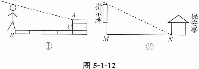 7. 小明和爸爸在公园散步,此时爸爸的影子落在了身后的地面和墙上,如图 5 - 1 - 12①。其中,$ BC $ 段为地上的影子,$ AC $ 段为墙上的影子。小明想利用所学知识测量出爸爸的身高。他向工作人员询问得知:公园地面与墙面所用的砖块均厚 $ 13.5 $ cm,长 $ 65 $ cm。经过测量,小明发现 $ BC $ 段刚好是 $ 4 $ 块地砖的长度,$ AC $ 段恰好为 $ 4 $ 块地砖的厚度。同一时刻,小明观察到公园门口指示牌影子的顶端刚好到达保安亭,如图 5 - 1 - 12②,其中 $ MN $ 为指示牌的影子。已知爸爸、墙面、指示牌和保安亭均与地面垂直,指示牌高 $ 2 $ m,指示牌距保安亭 $ 4 $ m,请你根据以上信息,帮小明求出爸爸的身高。