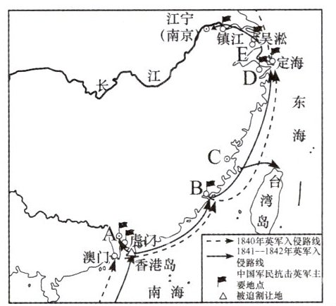 (2)名称:A:广州;B:厦门;C:福州;D:宁波;E:上海。(5分)影响:中国大门被打开;通商口岸成为列强对华商品输出的基地,加速了中国自然经济的解体;中国逐渐被卷入资本主义世界市场。(答出任意两点即可,4分)