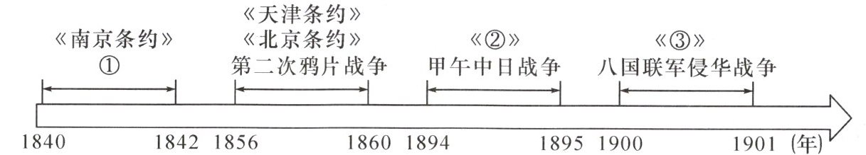 (1)①:鸦片战争;(2 分)②:马关条约;(2 分)③:辛丑条约。(2 分)