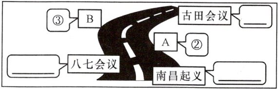 (1)历史事件:A处:秋收起义;(2分)B处:三湾改编。(2分)匹配素材:南昌起义——⑤;八七会议——④;古田会议——①。(各2分,共6分)