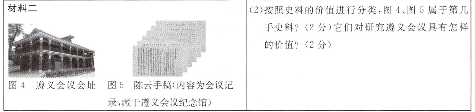 (2)按照史料的价值进行分类,图4、图5属于第几手史料?(2分)它们对研究遵义会议具有怎样的价值?(2分)