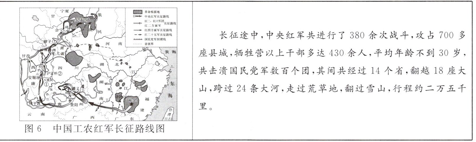 (3)长征行程约二万五千里,其中,最艰难的路程,最激烈的战斗,多在四川。请围绕本次研学主题,指出图6中①②两个地点发生的事件,(4分)并说明选择这两处作为代表性研学地点的理由。(2分)