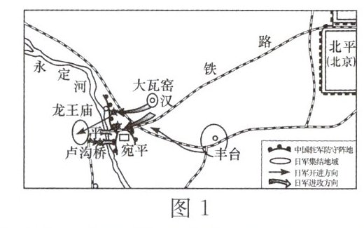 (1)观察图1,从卢沟桥战略位置的重要性,分析日军在此发动事变的原因。(2分)该事变的发生,对中国和日本分别意味着什么?(2分)