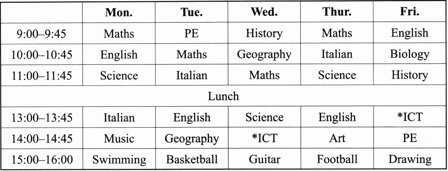 | 13:00-13:45 | Italian | English | Science | English | *ICT |