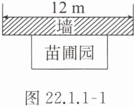 【例2】某中学课外活动小组准备围建一个矩形苗圃园,其中一边靠墙,另外三边用长为 $ 20 \, m $ 的篱笆围成。已知墙长为 $ 12 \, m $(如图22.1.1 - 1所示),设这个苗圃园垂直于墙的一边的长为 $ x \, m $。