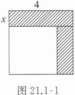 6. 如图 21.1 - 1,将边长为 $ 4 $ 的正方形,沿两边剪去两个宽为 $ x $ 的矩形,剩余部分的面积为 $ 9 $,根据题意列方程,并求出方程中二次项系数、一次项系数和常数项的和.