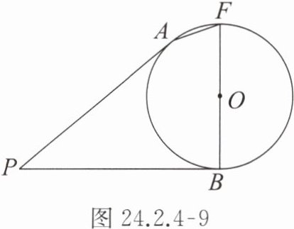 5. 如图 24.2.4 - 9,$ BF $ 为直径,$ P $ 是 $ \odot O $ 外的一点,$ PA $,$ PB $ 分别与 $ \odot O $ 相切于点 $ A $,$ B $,若 $ \angle P = 40^{\circ} $,求 $ \angle AFB $ 的度数。