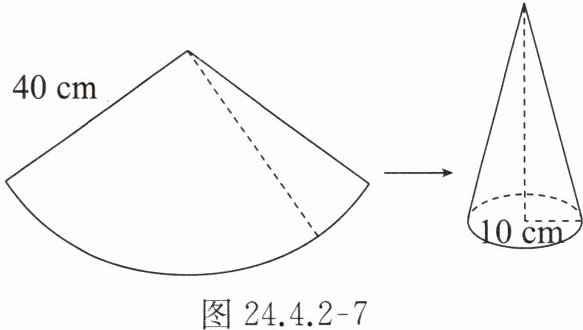 8. 如图24.4.2-7,现有$30\%$圆周的一个扇形彩纸片,该扇形的半径为40cm.小红为了在元旦联欢晚会上表演节目,她打算剪去部分扇形纸片后,利用剩下的纸片制作一个底面半径为10cm的圆锥形纸帽(接缝处不重叠),那么剪去的扇形纸片的圆心角为(