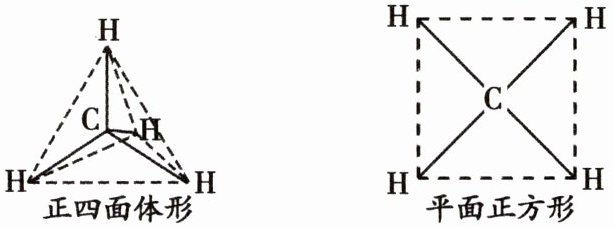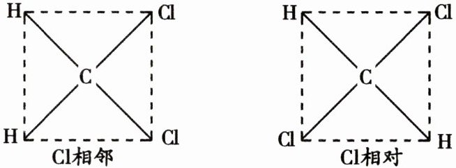 对于平面正方形,4个氢原子的位置虽然也相同,但相互间存在相邻和相对的关系,所以甲烷的一氯代物(CH₃Cl)、三氯代物(CHCl₃)、四氯代物(CCl₄)都只有1种,但二氯代物(CH₂Cl₂)却有2种(如图所示)。
