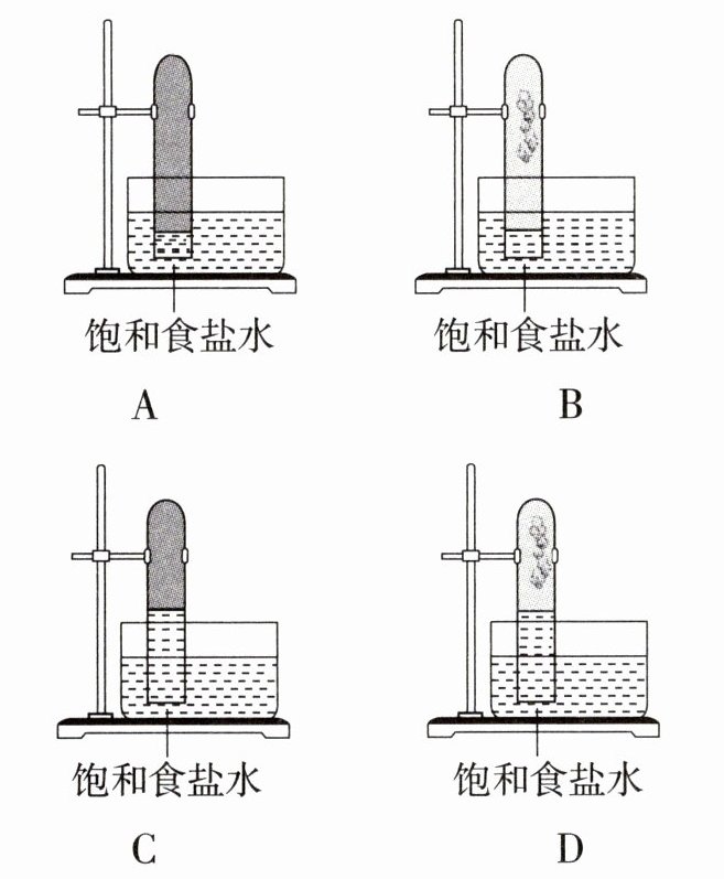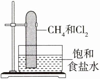 D解析▶ 甲烷与氯气在光照条件下反应,生成CH₃Cl、CH₂Cl₂、CHCl₃、CCl₄和HCl,试管内气体颜色变浅;由于CH₂Cl₂、CHCl₃、CCl₄为不溶于水的油状液体,故试管内壁有小液滴;又因HCl溶解于饱和食盐水中,使试管内气体的压强小于外界大气压,导致试管内液面上升,综合上述分析,D项正确。