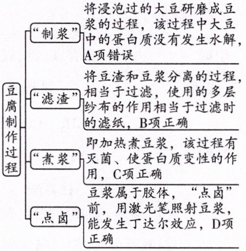 例2-13 [教材溯源题·来源于教材P115“研究与实践”豆腐的制作]《史记》中有记载,大豆起源于中国,劳动人民早在两千多年前就开始利用大豆制作豆腐,其制作过程大致为“制浆”“滤渣”“煮浆”“点卤”,下列说法错误的是