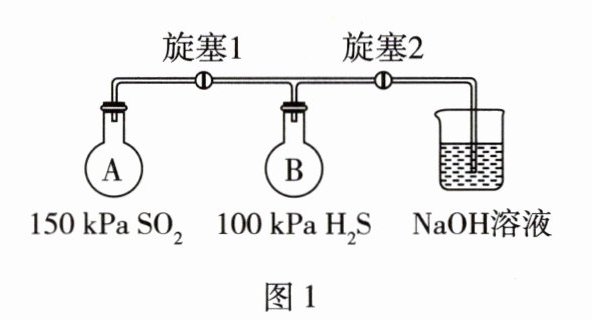 (2)根据$pV = nRT$,$T$、$V$相同时,$n$与$p$成正比,则初始时$n(SO_{2}):n(H_{2}S)=p(SO_{2}):p(H_{2}S)=3:2$,而反应按$n(SO_{2}):n(H_{2}S)=1:2$进行,则$SO_{2}$过量。由于反应后压强减小,且小于外界大气压,所以当打开旋塞2时,可观察到$NaOH$溶液倒吸到B瓶中,$NaOH$与剩余的$SO_{2}$发生反应。