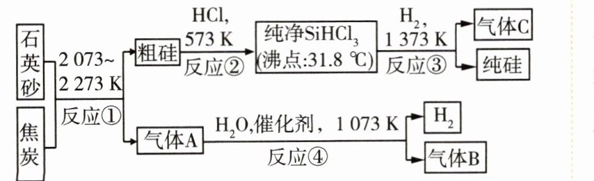 解析 反应①是$SiO_2 + 2C \xlongequal{2073~2273K} Si + 2CO↑$,反应②是$Si + 3HCl \xlongequal{573K} SiHCl_3 + H_2$,反应③是$SiHCl_3 + H_2 \xlongequal{1373K} Si + 3HCl$,反应①②③均属于置换反应;反应④为特定条件下的反应:$CO + H_2O(g) \xlongequal[催化剂]{1073K} H_2 + CO_2$,不属于置换反应。气体A、B、C分别为CO、$CO_2$、HCl,其中$CO_2$是温室气体,是减排的目标气体,$CO_2$或HCl通入$Na_2SiO_3$溶液中都能够生成白色沉淀($H_2SiO_3$)。