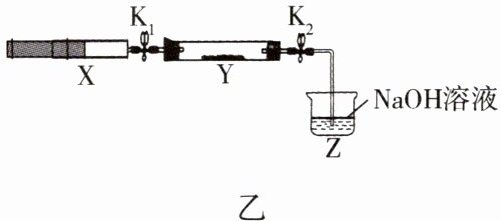 将上述收集到的NH₃充入注射器X中,硬质玻璃管Y中加入少量催化剂,充入NO₂(两端用夹子K₁、K₂夹好)。在一定温度下按图乙所示装置进行实验。