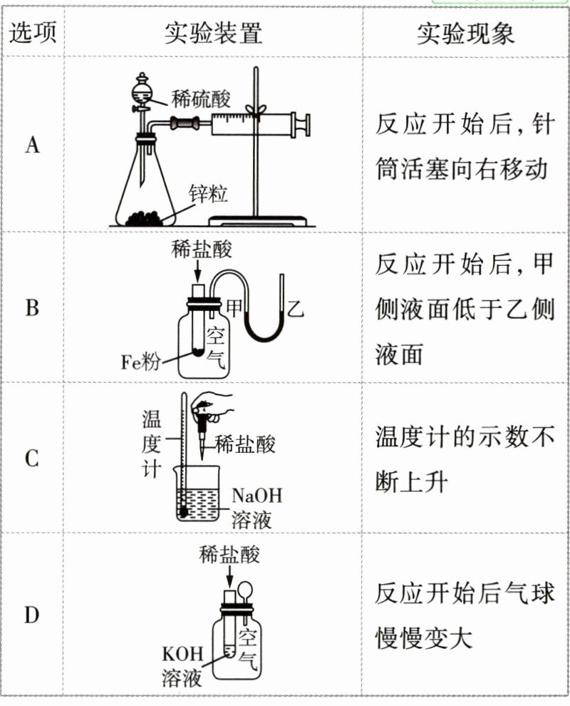 【解析】A项:锌粒与稀硫酸反应生成氢气,锥形瓶内气体增多,压强增大,即使反应不放热,生成的气体也会使针筒活塞向右移动,故活塞移动不能说明反应放热;