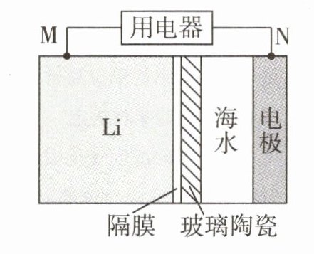 该电池属于一次电池,D项正确。Li是活泼金属,作负极,电极反应式为Li-e⁻ = Li⁺。N极是正极,发生还原反应,B项错误。海水中含有大量的电解质,A项正确。由于Li易与水反应,故玻璃陶瓷应具有良好的防水功能,同时为了形成闭合回路,也应具有传导离子的功能,C项正确。
