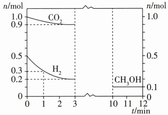(1)由题图可知,3 min时$CO_2$、$H_2$的物质的量不再变化,说明3 min时反应达到化学平衡状态。由题图可知达到平衡时,$CO_2$的物质的量变化量为$1.0 mol - 0.9 mol = 0.1 mol$,$H_2$的物质的量变化量为$0.5 mol - 0.2 mol = 0.3 mol$,$CH_3OH$的物质的量变化量为$0.1 mol$,故反应方程式中$CO_2$、$H_2$、$CH_3OH$的化学计量数之比为$0.1 mol:0.3 mol:0.1 mol = 1:3:1$,结合原子守恒可得该反应的化学方程式为$CO_2(g) + 3H_2(g) \rightleftharpoons CH_3OH(g) + H_2O(g)$。