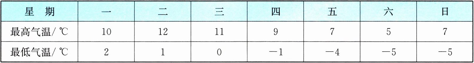 五:7-(-4)=11℃,六:5-(-5)=10℃,日:7-(-5)=12℃