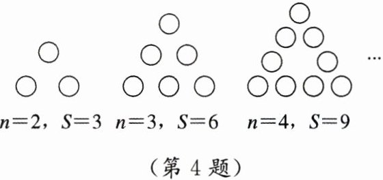 4. 如图是由若干圆圈组成的形如三角形的图案,每条边(包括两个端点)有$ n(n>1) $个圆圈,每个图案圆圈的总数是S,按此规律,推断S与n之间的表达式.