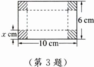 3. 如图,长方形纸板的长为10 cm,宽为6 cm,四角割去边长为x cm的小正方形后折叠形成一个无盖长方体.该长方体的体积是多少?(用含x的代数式表示)