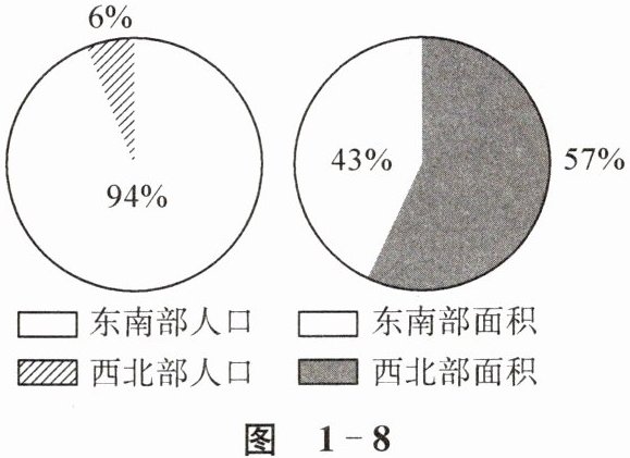 读图1-8“我国东南部与西北部地区人口和面积占我国人口和面积比例示意”,完成第4~6题。